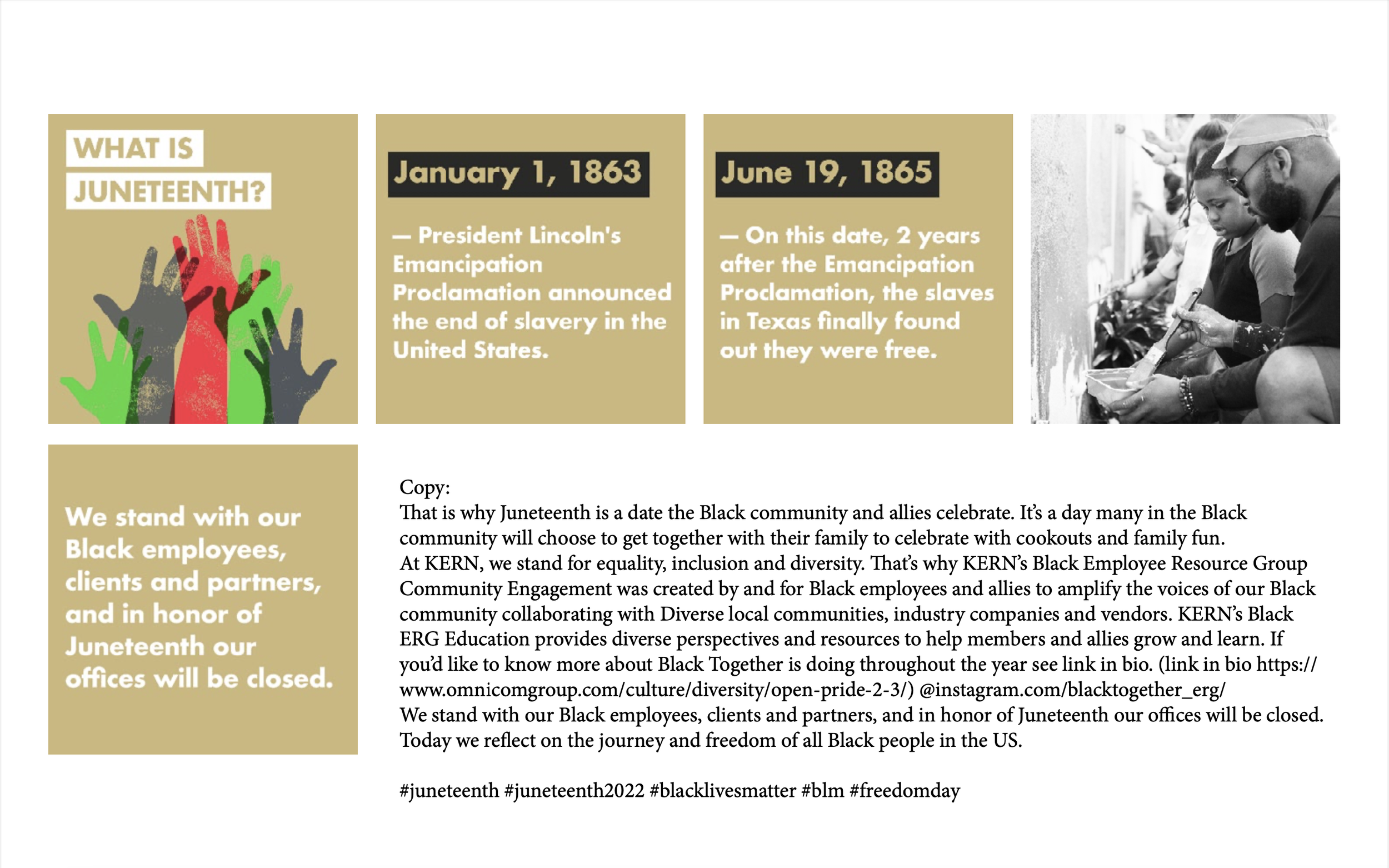 In my first meeting of the day with my manager, Denise, she explained I was put to the task of creating the Juneteenth social post for KERN’s instagram. Working in social media was something I had always wanted to do, would I like it?